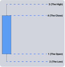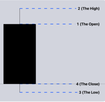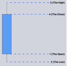 A candlestick also known as a candle is a representation of price movement over time. At the end of that time the candle will either close lower than where it opened, higher than where it opened or close in the same place.